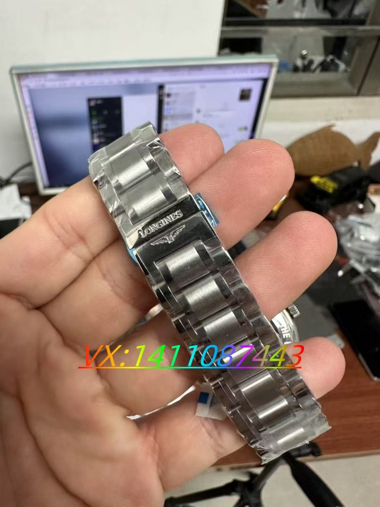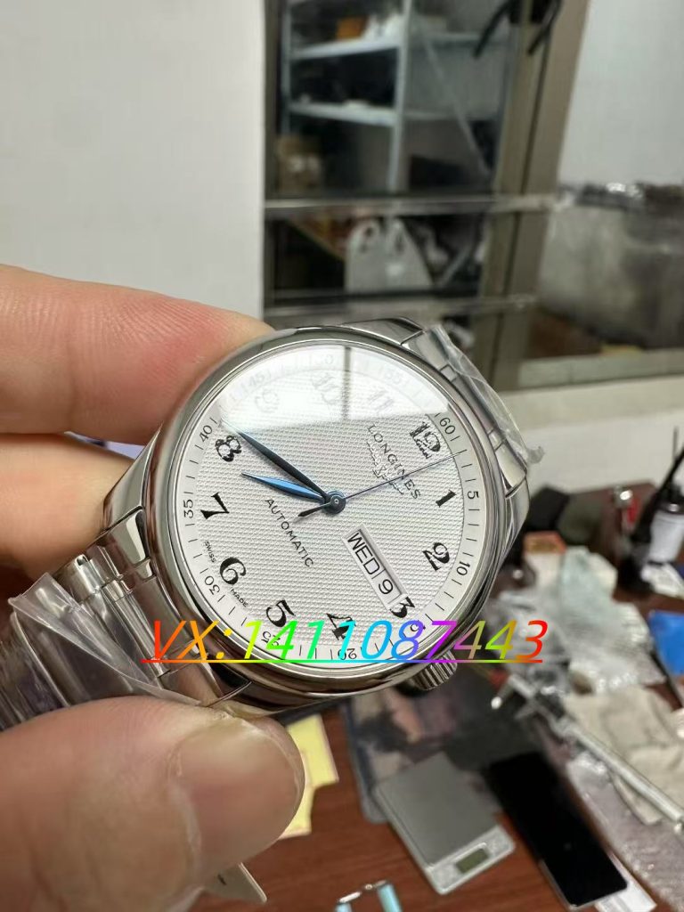 表盤是這款表的一大亮點。KZ 工廠對表盤細節處理極為用心,銀色麥粒紋盤面精致細膩,紋理清晰且均勻分布,與正品相比毫無二致,為表盤增添了豐富的層次感和質感。表盤外緣的數字外圈設計方便讀數,數字字體的大小、粗細以及印刷工藝都精準復刻了正品。表盤上的浪琴 logo 清晰醒目,立體感強。日歷窗位于三點和四點鐘位置之間,KZ 完美修正了雙日歷容易出現不正的問題,日期和星期顯示清晰,字體大小和顏色與正品一致,且窗口邊緣整齊,沒有毛糙感。?