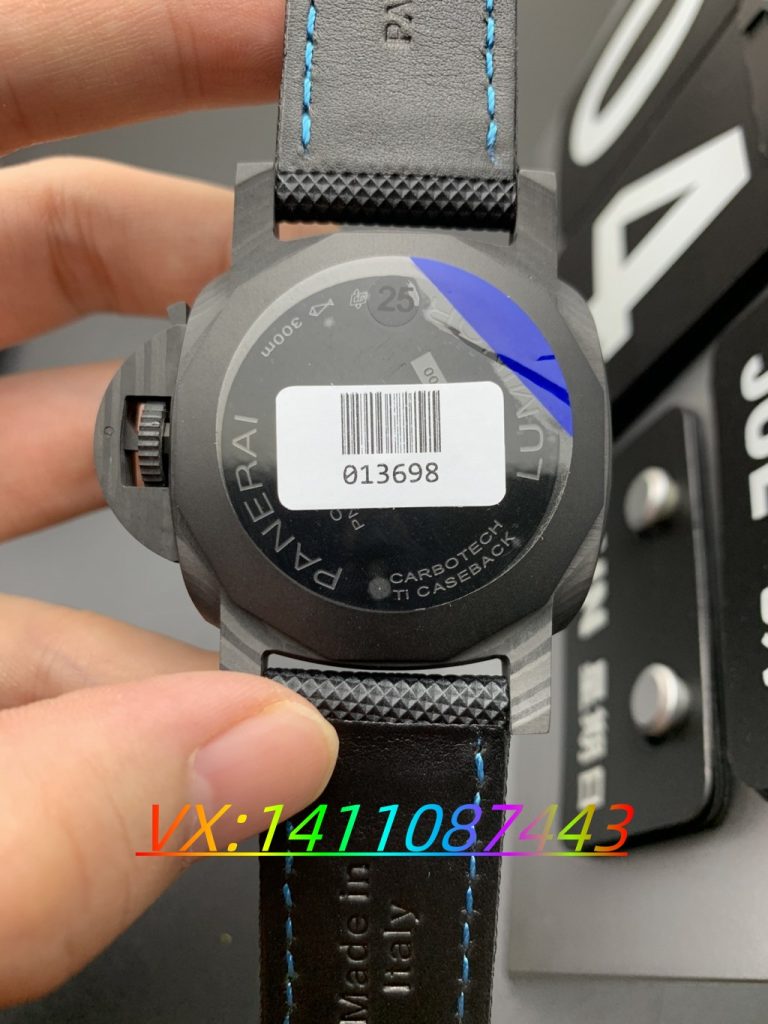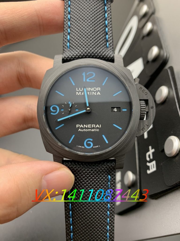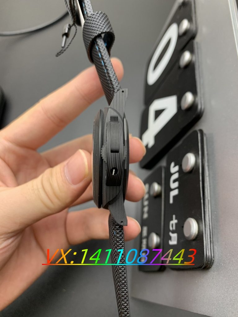 VS 廠沛納海 PAM1661 碳纖維材質(zhì)復(fù)刻腕表,外觀尺寸直徑為 44mm,厚度 14mm。與同尺寸腕表相比,它重量明顯更輕,這得益于其選用的聚合碳纖維 Carbotech 原料,使得上手感覺格外輕盈。腕表整體做工精良,輕量化的碳纖維表殼,搭配經(jīng)典的三明治表盤以及藍(lán)色超級夜光涂層,再配上沛納海防水材質(zhì)的黑色表帶與藍(lán)色縫線,仿佛將內(nèi)在的強悍力量化為微光,為佩戴者指引前行方向。