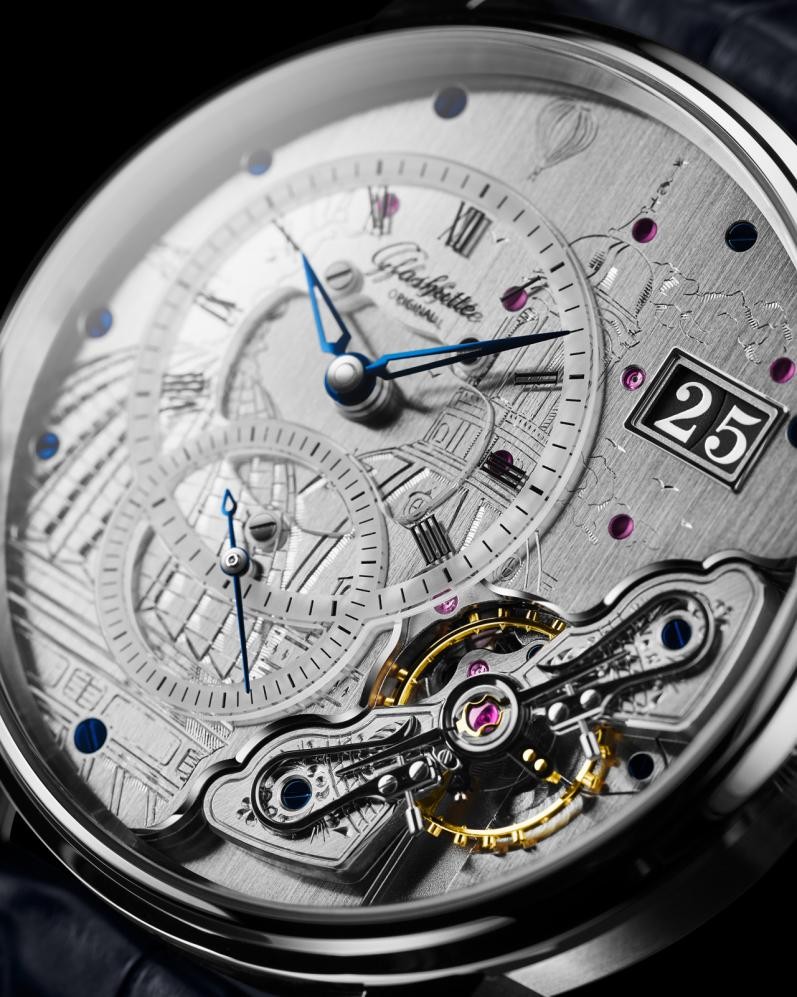 螺絲擺輪還是機芯內的視覺焦點所在,其精巧的結構、細膩的工藝,充分彰顯了格拉蘇蒂原創制表師的精湛技藝以及對美學的執著追求。以偏心機芯倒置腕表獨特的機芯設計為例,部分機芯組件采用倒置安裝方式,使得機芯的精密構造能夠直接從表盤正面得以觀賞。這一設計仿佛為我們開啟了一扇通往機械運作奧秘的窗口,在飾有精美手工雕刻的擺輪夾板之下,擺輪優雅的律動清晰可見。格拉蘇蒂制表的傳統精髓與現代制造工藝巧妙融合,共同塑造出這種獨特且具現代感的 “建筑美學”。
