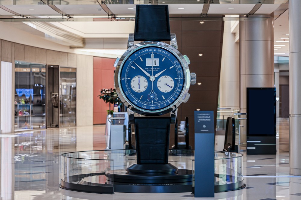朗格 DATOGRAPH 大日歷計時動力儲存指示巨型腕表裝置,現陳列于深圳萬象城一期一層中庭。